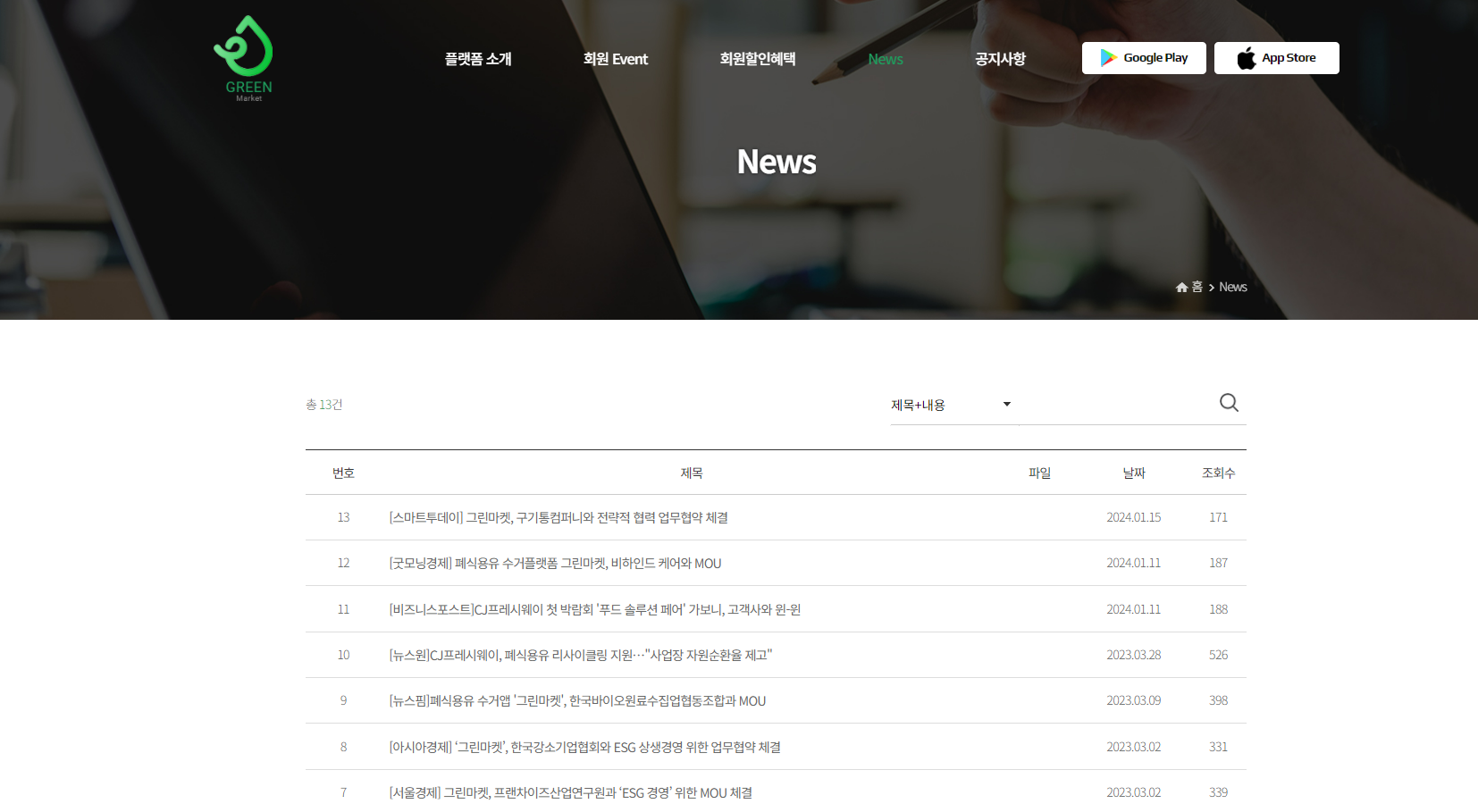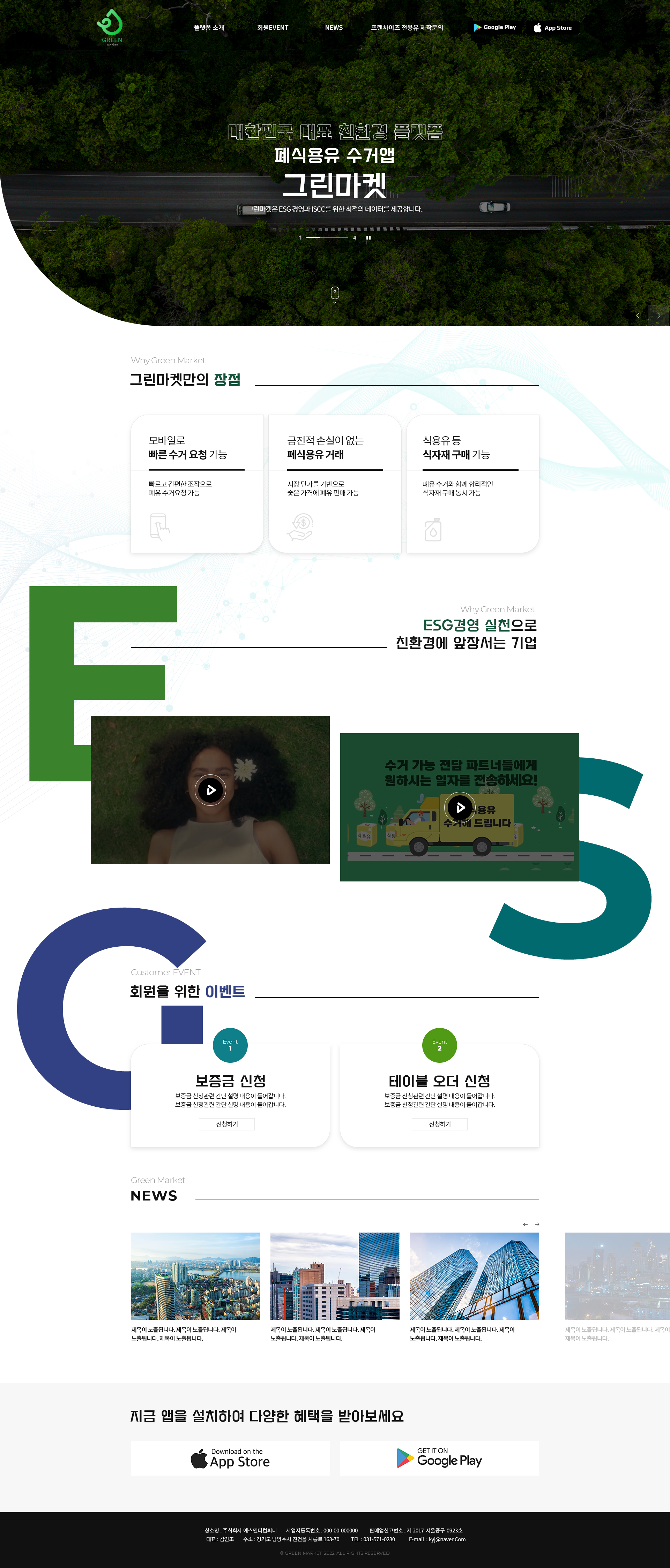 친환경 플랫폼을 강조하기 위해서 ESG 경영실천으로 친환경을 위한 노력에 앞장서고 있는 회사의 노력을 전면에 배치하여 소개하였습니다.