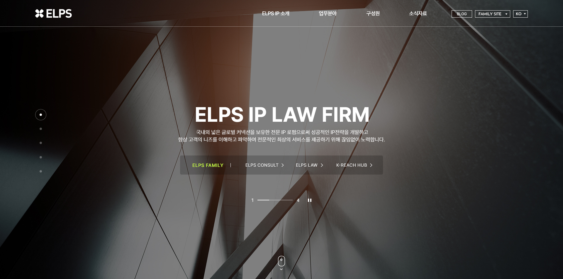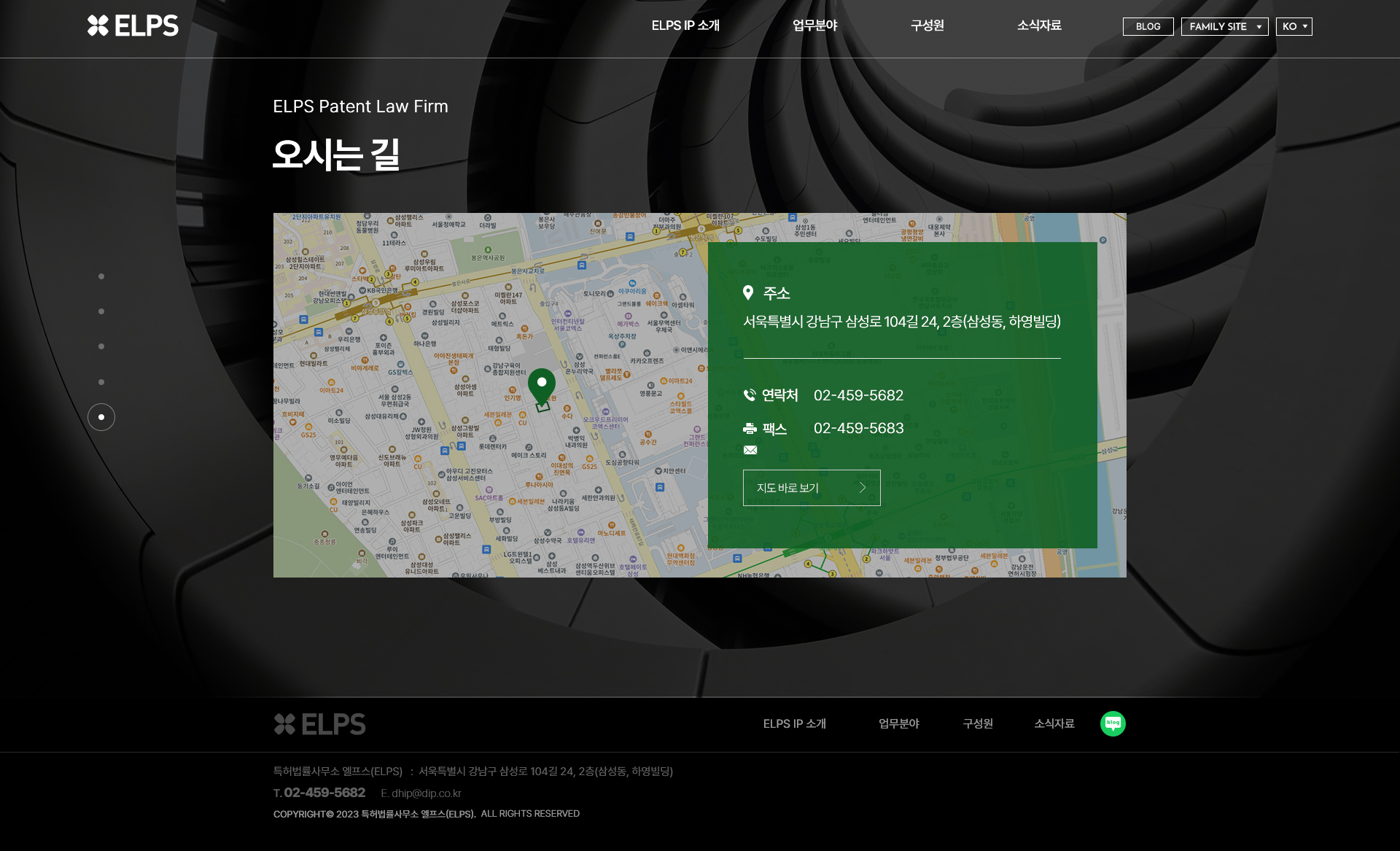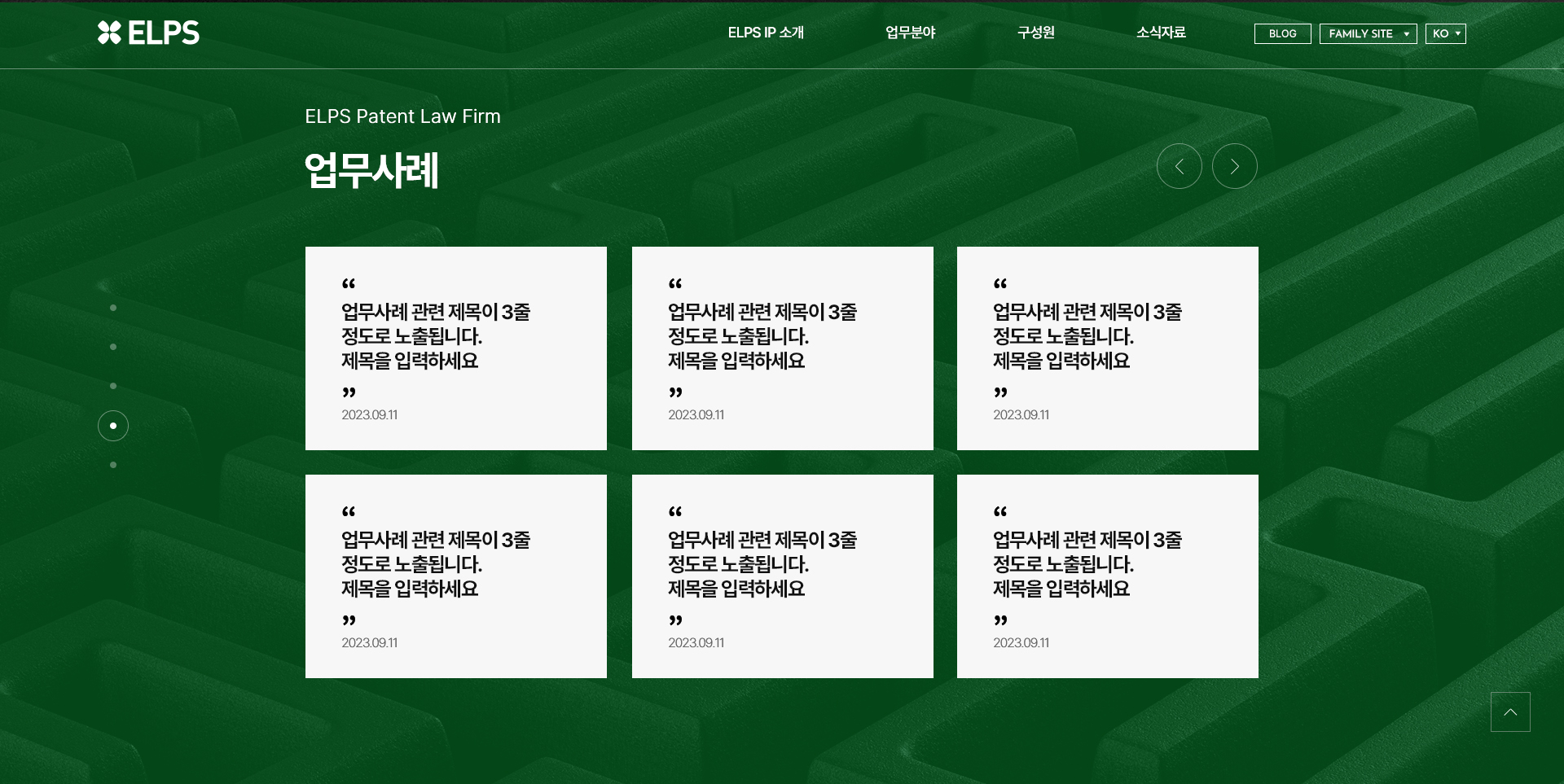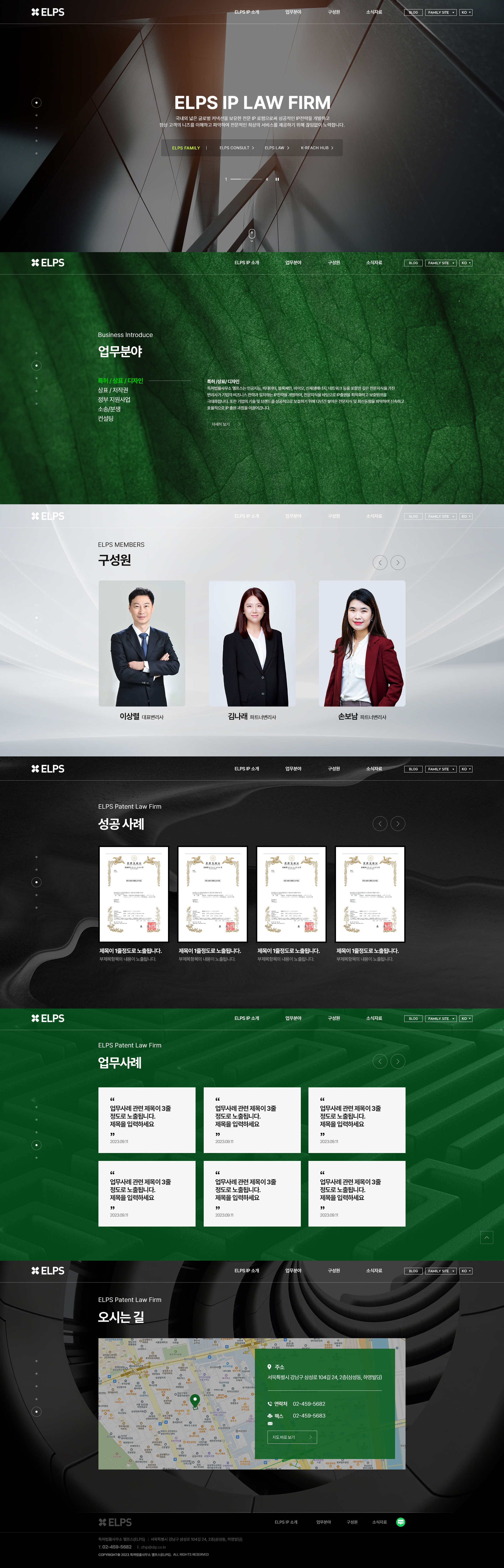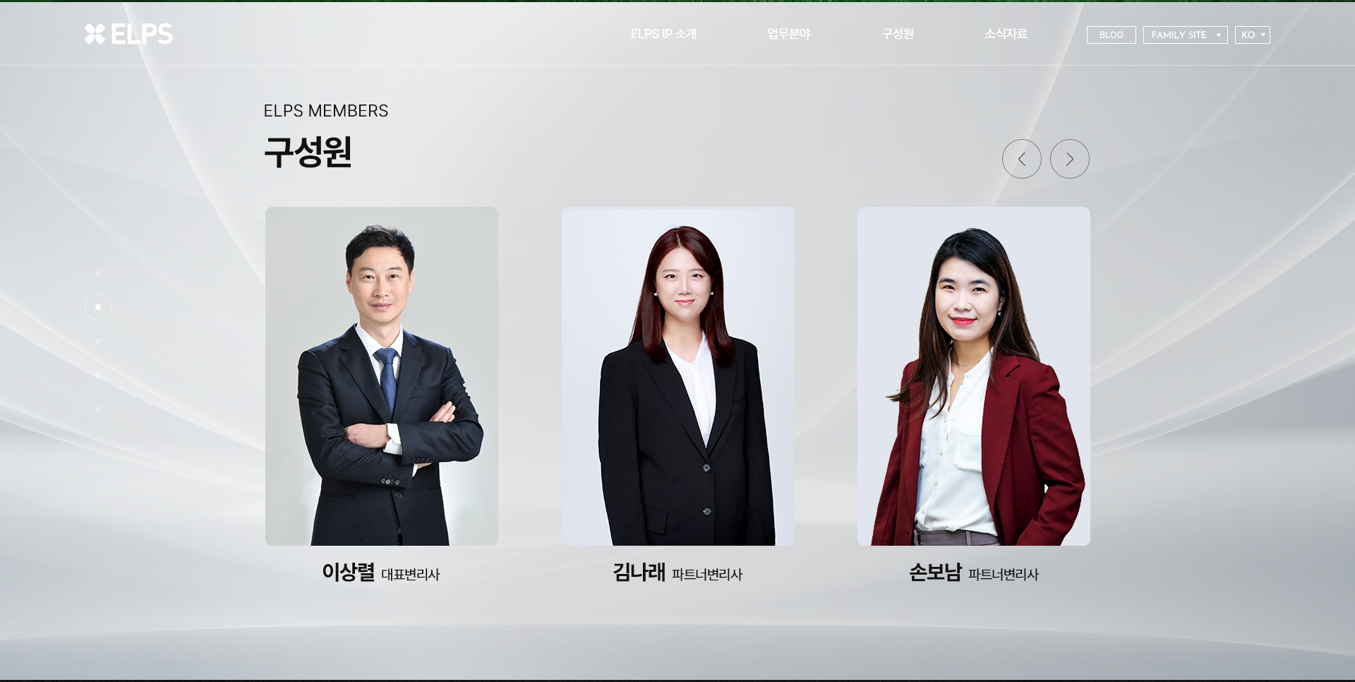 ELPS 특허법률사무소의 경우 이전에 2차례 정도 제작 진행하였던 ELPS 컨설팅 홈페이지 ( http://www.elps.co.kr/ ) , ELPS 법률사무소 (http://elpslaw.com/) 홈페이지와 Tone &Manner를 맞춰서 통일성 있게 제작이 진행되었습니다.