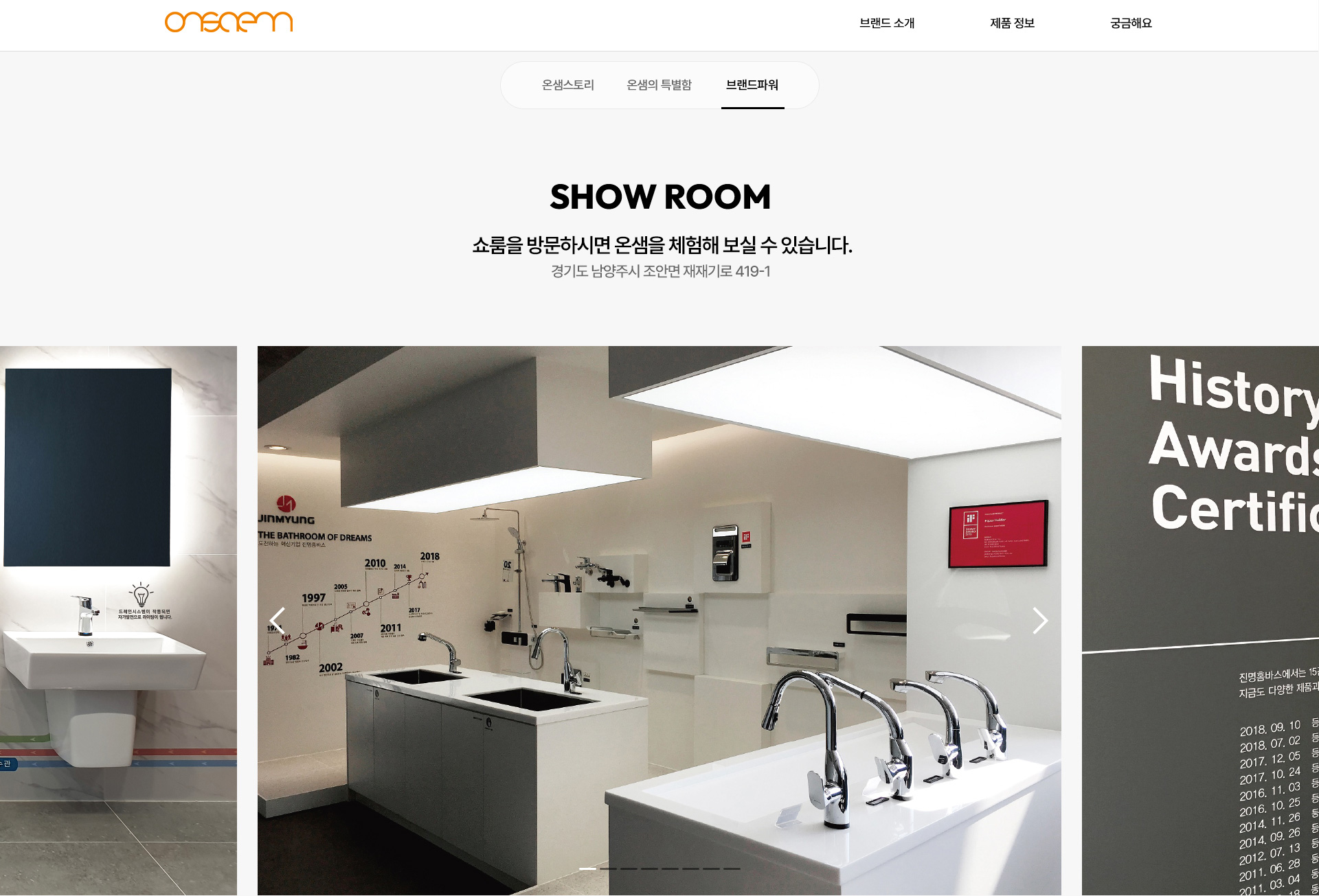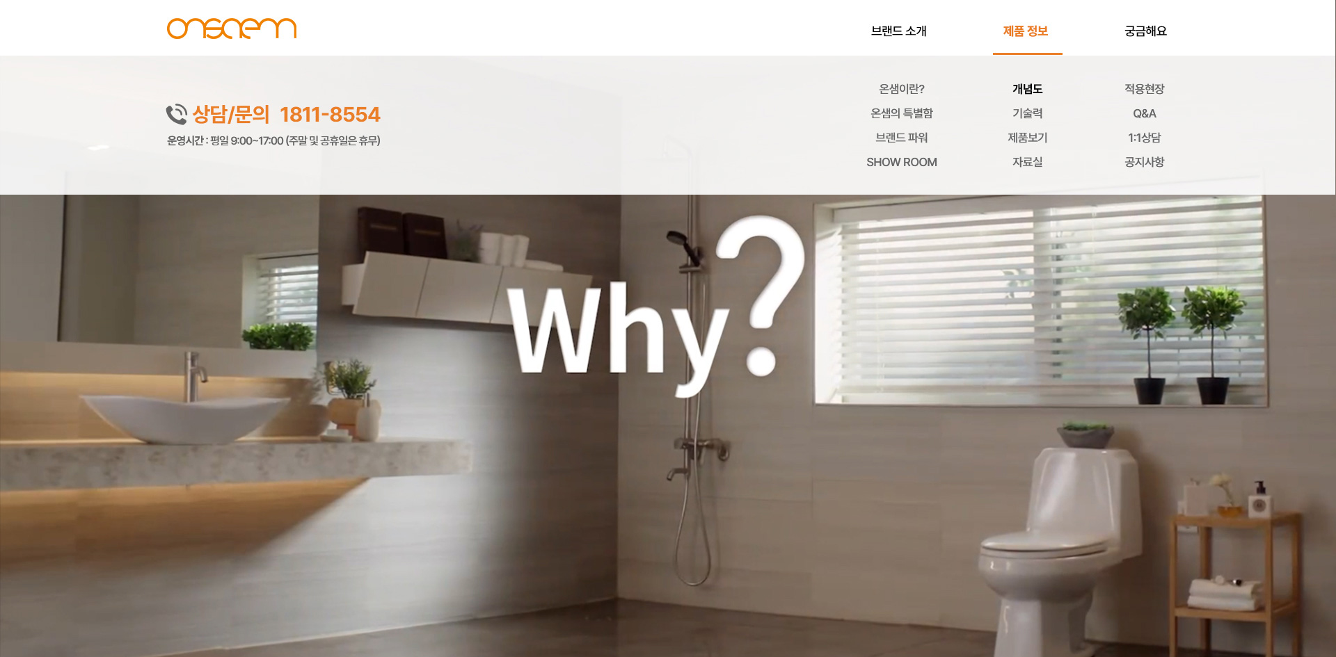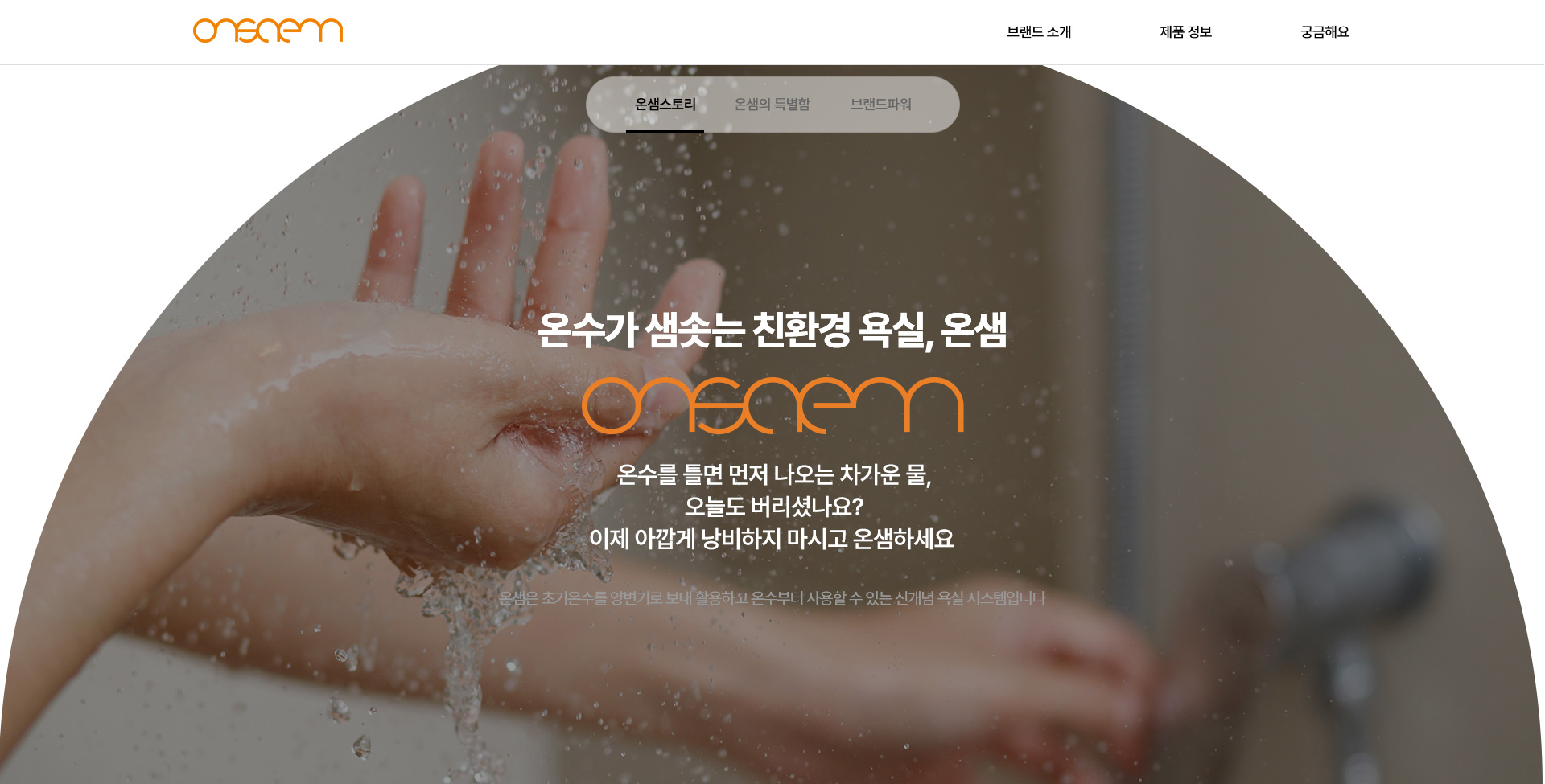 직접 남양주 본사를 찾아서 해당 욕실 시스템인 온샘에 대한 기술 소개를 영상으로 보면서, 중소기업 50년의 기술력과 노하우로 탄생한 이 브랜드를 확실히 홍보해드리고 싶단 생각으로 사이트의 디자인과 컨셉을 잡으면서 저희도 나름 재미있고 뿌듯했던 작업이었으며, 클라이언트의 만족감이 높았던 결과물이였기에 온샘 브랜드의 특별함과 브랜드 파워를 한단계 업그레이드 시켜드린 프로젝트임을 자부합니다.