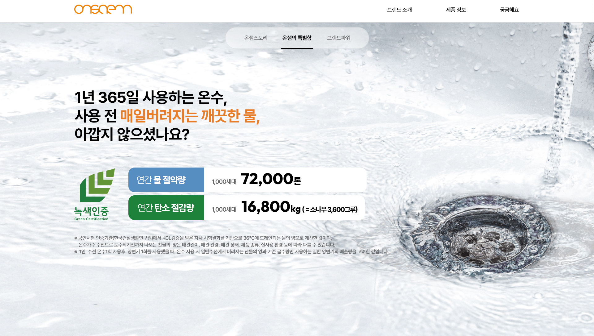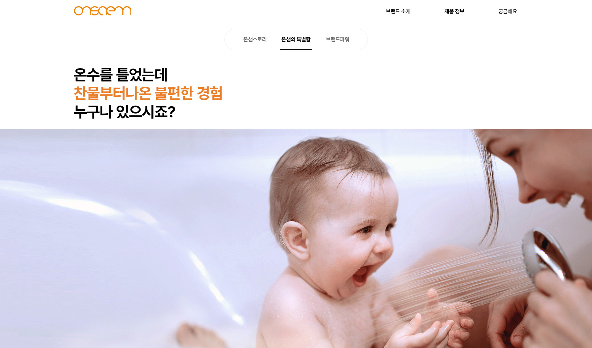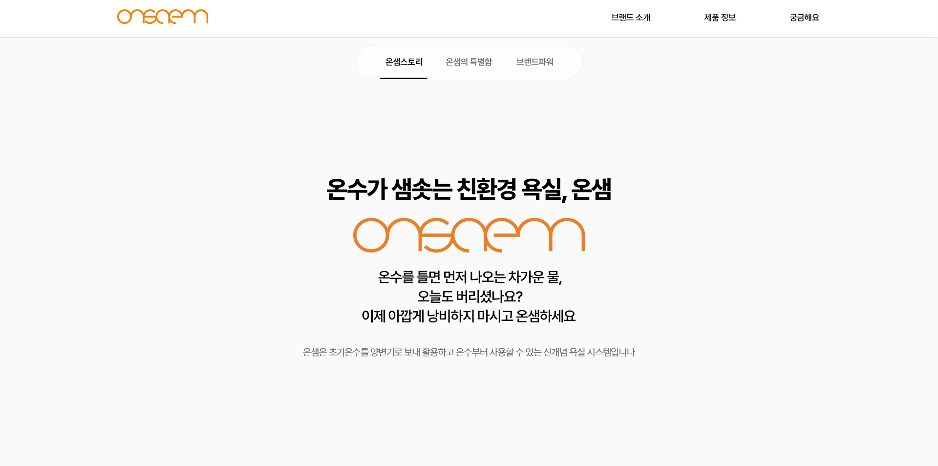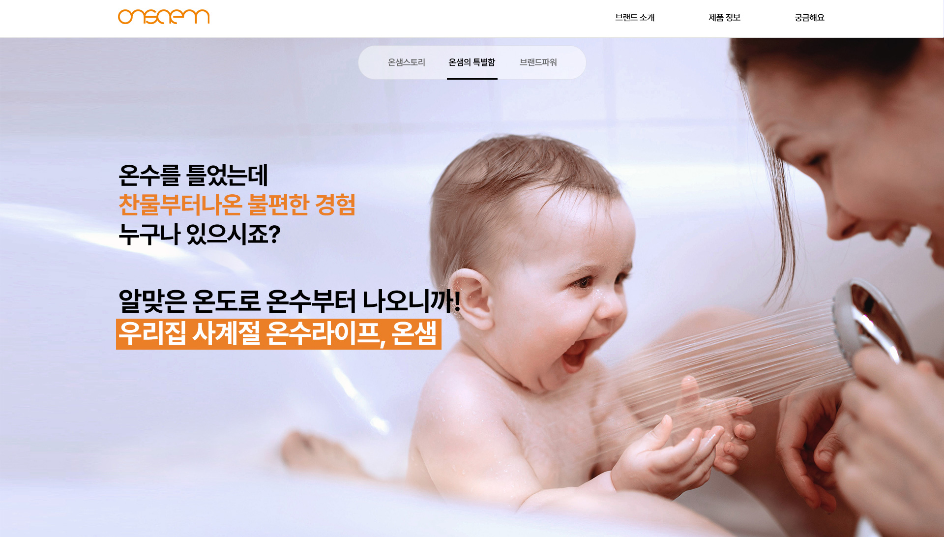 직접 남양주 본사를 찾아서 해당 욕실 시스템인 온샘에 대한 기술 소개를 영상으로 보면서, 중소기업 50년의 기술력과 노하우로 탄생한 이 브랜드를 확실히 홍보해드리고 싶단 생각으로 사이트의 디자인과 컨셉을 잡으면서 저희도 나름 재미있고 뿌듯했던 작업이었으며, 클라이언트의 만족감이 높았던 결과물이였기에 온샘 브랜드의 특별함과 브랜드 파워를 한단계 업그레이드 시켜드린 프로젝트임을 자부합니다.